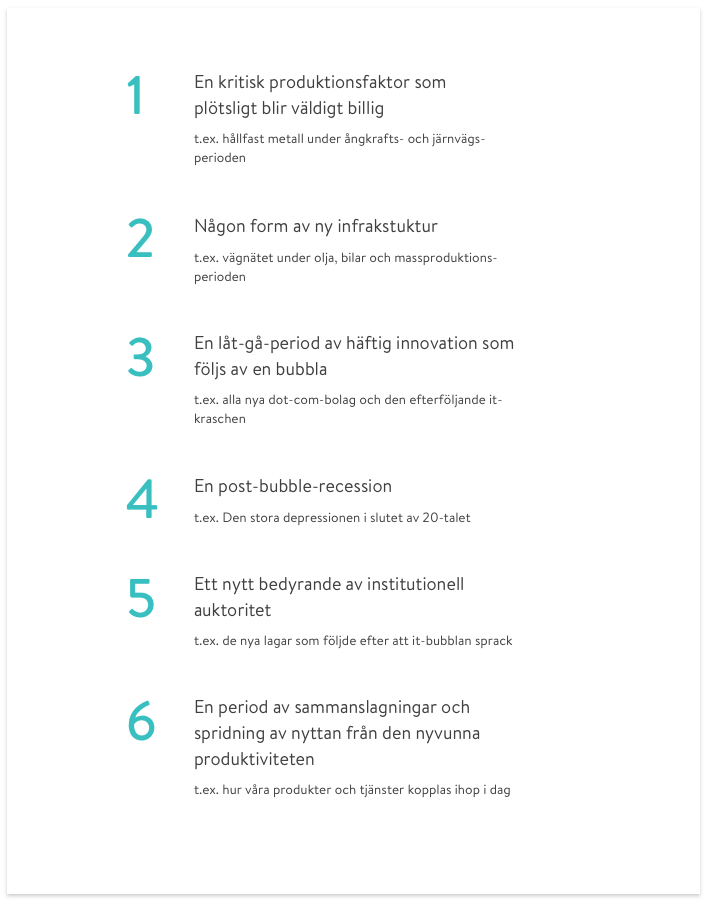 Oavsett om det handlar om ångkraft, stål, bilar eller informationsteknologi börjar det alltså med en kritisk produktionsfaktor som plötsligt blir billig och slutar med en period av sammanslagningar och spridning av nyttan som den nya teknologin för med sig.
