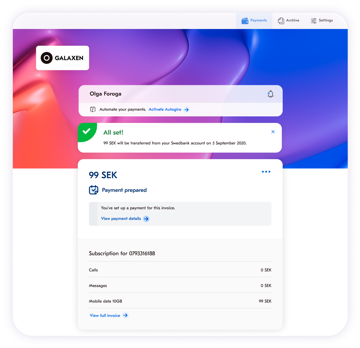 Obetalda fakturor visas som kort, vilket gör det enkelt att klicka sig vidare till betalning.