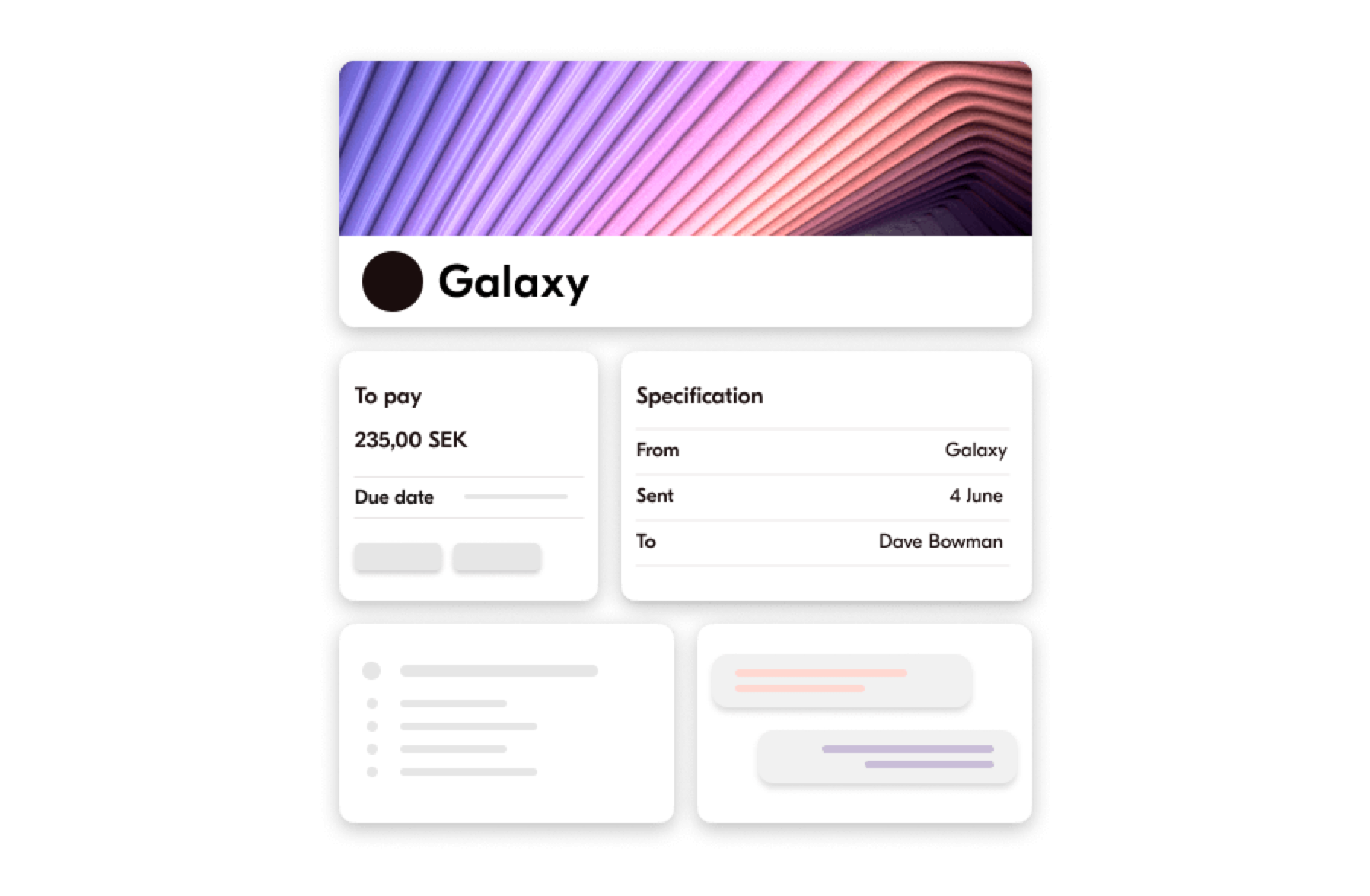 Varje steg i vår betalupplevelse är designat för att skapa en känsla av lätthet och kontroll hos din slutkund. Vi har klippt banden till pappersfakturan genom att ta bort mycket av den fakturajargong som inte har någon funktion 2019. Målet är en upplevelse som gör att slutkunden har energi över till mer personlig kommunikation från dig som leverantör. Självklart kan du säkerställa att er betalupplevelse andas er branding med egna bilder och er logotyp.