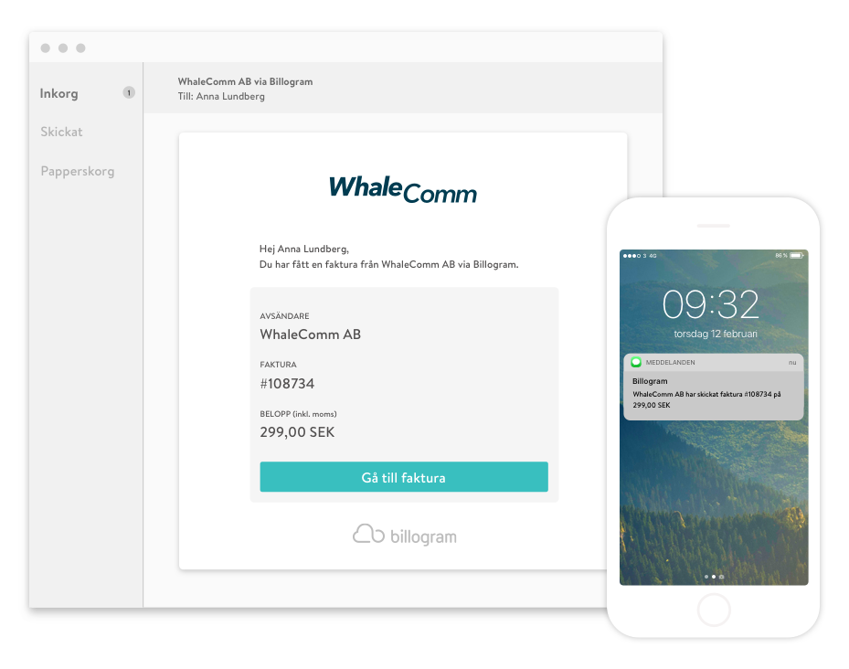När du tar emot en interaktiv faktura från Billogram, så dyker den antingen upp som ett SMS eller via e-post.