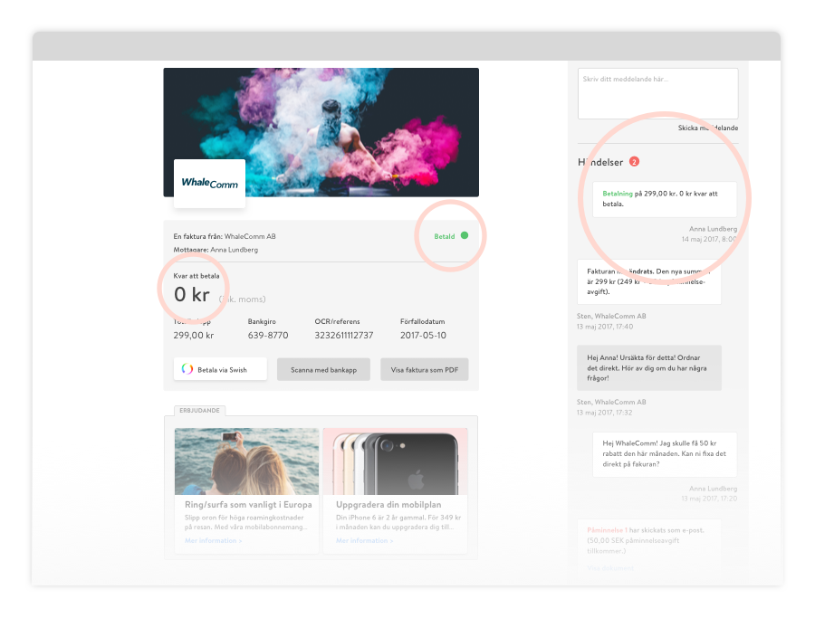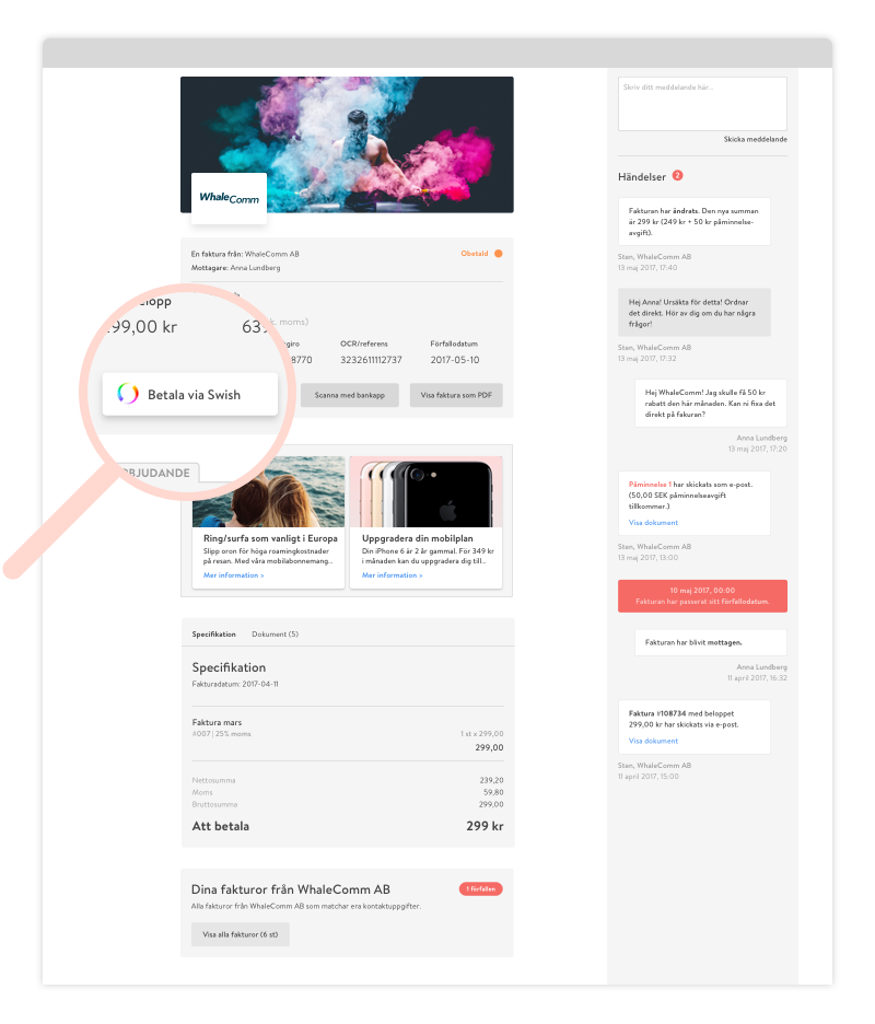 Med den kommer en länk som tar dig direkt till fakturan. Här ser du sen tydligt dina kostnadsposter, kan chatta med kundtjänst och ta del av nyttig information från din leverantör. När det sen är dags betala kan du välja att skanna fakturan med din bankapp, eller (dra igång trumvirveln) klicka på ‘Betala via Swish’.