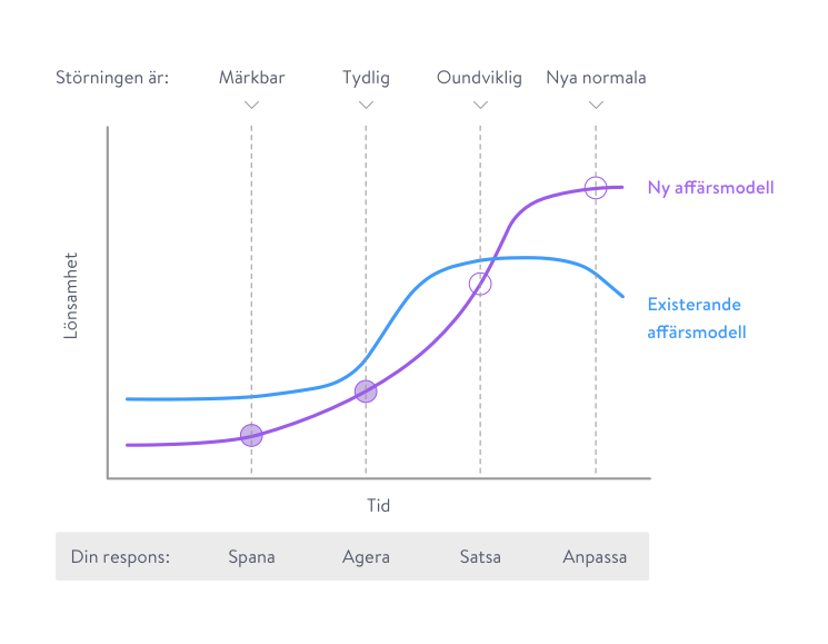 Modellen delar in disruptionen, eller störningen, i 4 steg från en störning som är märkbar till en störning som är det nya normala. Den blå kurvan visar sedan lönsamheten över tid utifrån en existerande affärsmodell som inte tar hänsyn till störningen och den lila kurvan visar lönsamheten över tid för en affärsmodell som istället tar hänsyn till störningen.