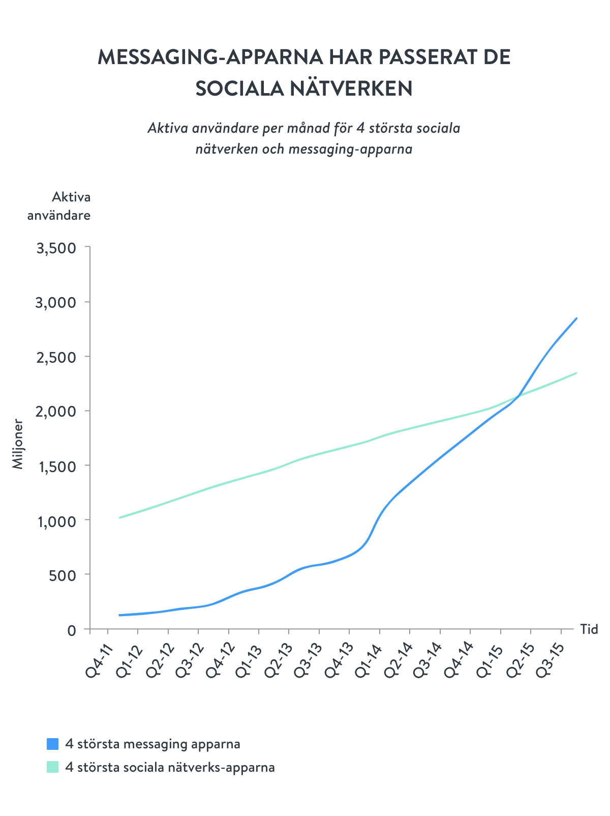 Samtidigt visar också användarnas beteende att behovet av konversationer i olika former aldrig varit större. Hösten 2016 rapporterade bland annat Business Insider att messaging-apparna under 2015 gick om de sociala nätverken sett till aktiva användare per månad.