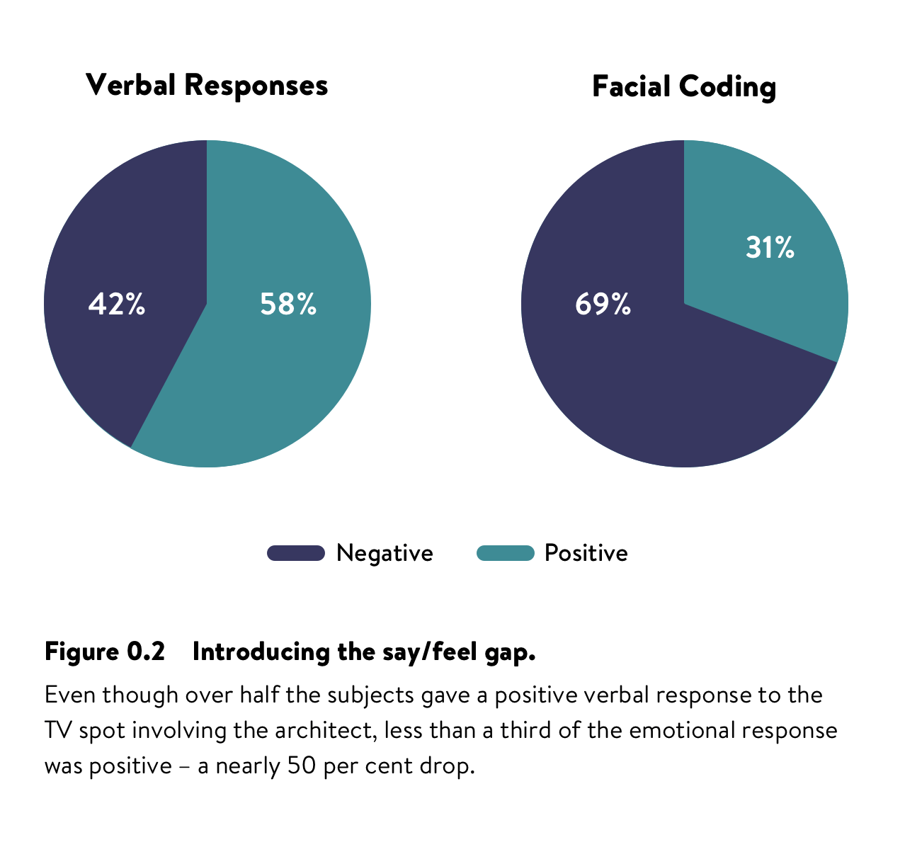 Facial coding har sedan gång på gång använts för att med stor framgång läsa av hur folk verkligen känner och tyda underliggande motiv. Det blir en väg rakt in i den emotionella hjärnan, utan att resultaten av vår mätning förvrängs av den rationella hjärnan som ofta riskerar att hända när vi ställer frågor, något som Dan Hill, författare av boken Emotionomics (rekommenderad läsning för den som vill veta mer om ämnet) kallar för "the say/feel gap". I grafen nedan presenteras hur en målgrupps känslor (positiva vs negativa) för en TV-annons skiljde sig åt när de studerades via en verbal undersökning och facial coding samtidigt.