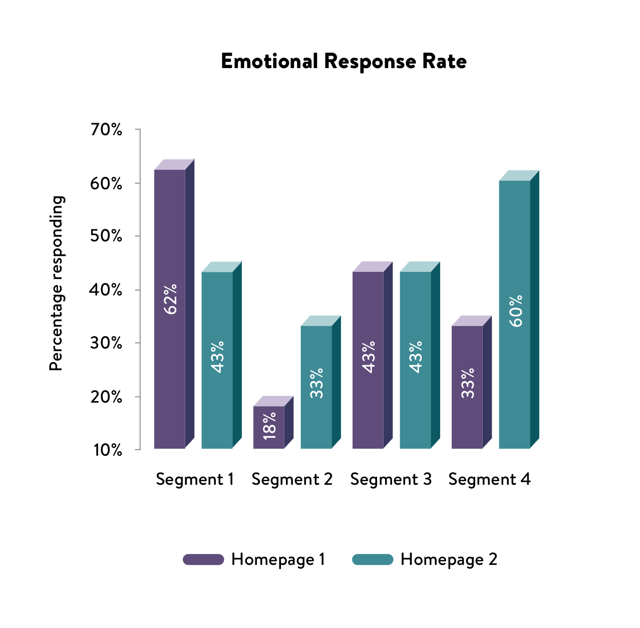 Så här skulle det kunna se ut om vi testar två olika varianter av en hemsida. Vi delar upp hemsidorna i fyra segment och sedan mäter vi med hjälp av facial coding andelen som visade någon reaktion alls till de olika segmenten. På så sätt kan vi se vilka segment och vilken variant av hemsidan som verkar ge mest reaktion från vår målgrupp. Vi kan även se att Hemsida 1 har en genomsnittlig response rate på 39% samtidigt som den är 45% för Hemsida 2.