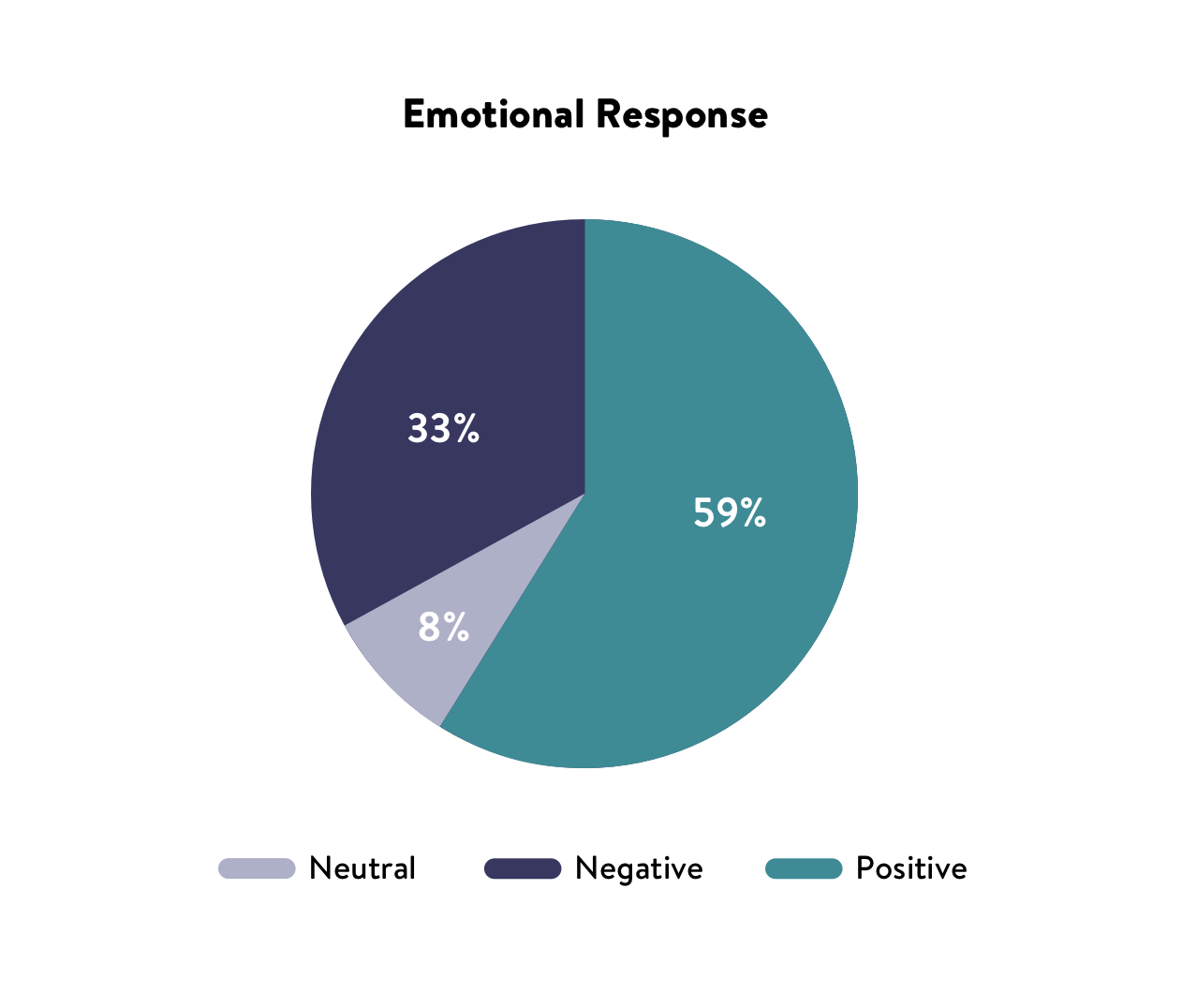 Ett logiskt nästa steg när vi utvärderat hur stor andel reaktioner vi fått, är att bryta ner dem i fördelningen mellan positiva, neutrala och negativa känslor reaktionerna bestod av. Här behöver kanske inte en negativ känsla nödvändigtvis betyda ett dåligt resultat, beroende på vad det är för känsla vi siktar på att framkalla och hur interaktionen är uppbyggd, även om man som regel såklart tjänar mest på att framkalla positiva känslor.