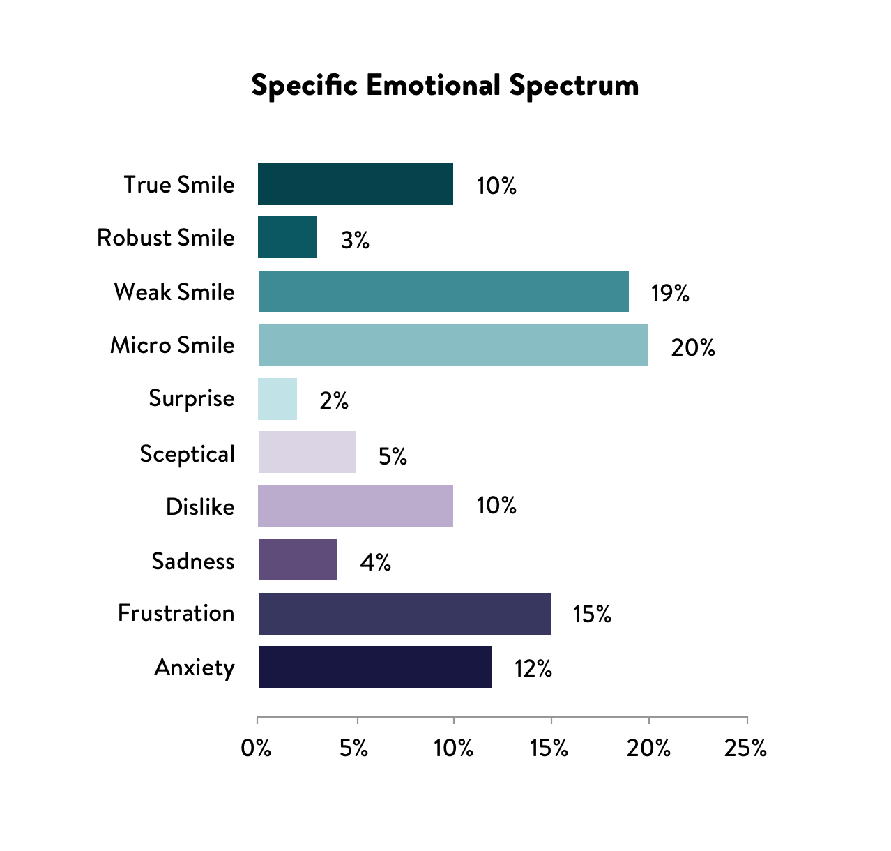 Känslor med grön nyans är positiva känslor, känslor med lila nyans är negativa känslor. Leenden uppdelas i sanna leenden och sociala leenden som ofta är mer reserverade. Överraskning ses som aningen positivt här då det skapar uppmärksamhet.