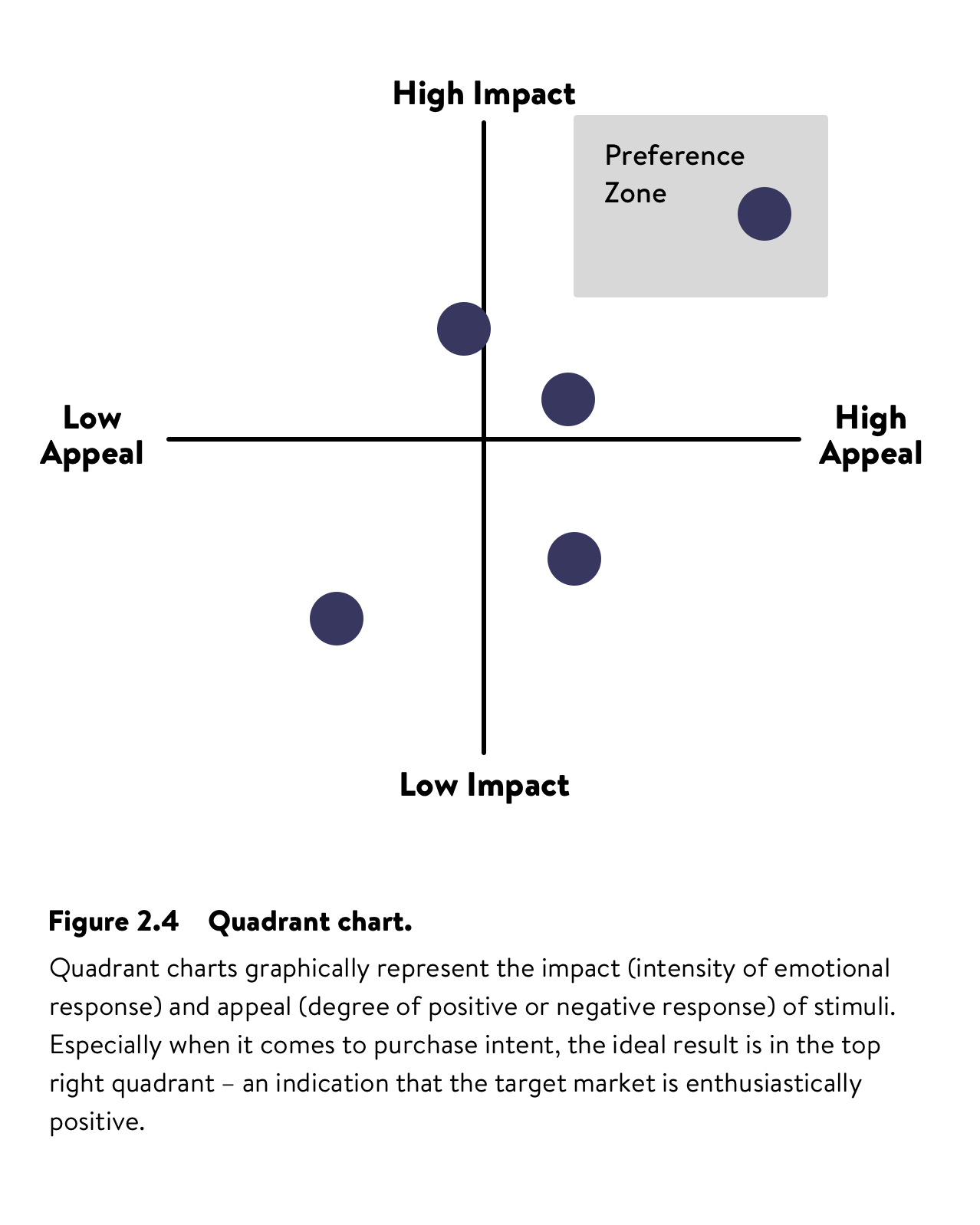 Impact handlar om hur intensiv reaktionen var (tänk lite överraskad kontra extremt chockad) och appeal handlar om hur positiv eller negativ reaktionen var (tänk upprörd kontra litet leende kontra extas). Här vill man hamna så högt upp i högra hörnet som möjligt, det vill säga att målgruppen är entusiastiskt positiv.