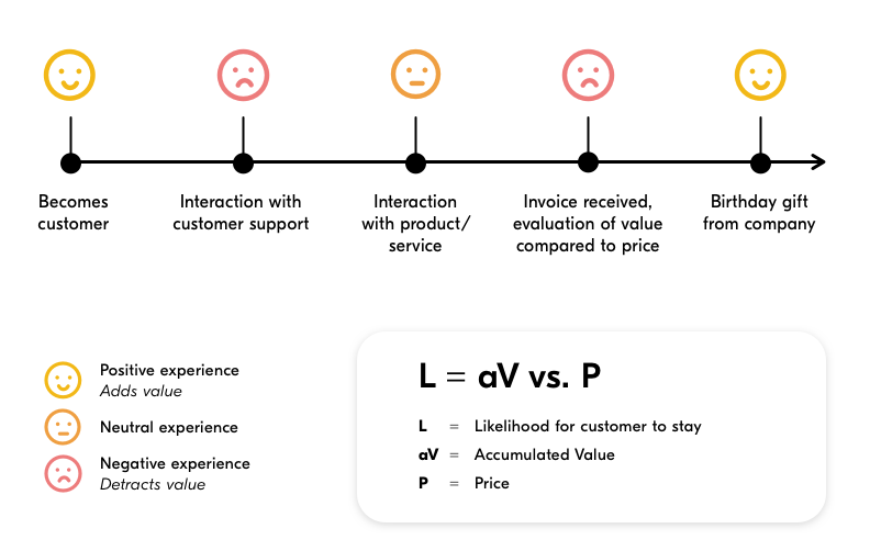 En annan intressant aspekt är hur dessa upplevelser sammantaget ställs mot faktiskt pris vilket betyder att högt prissatta produkter/tjänster kräver ett större sammantaget ackumulerat upplevt värde, än för de leverantörer som befinner sig i lågpris-segmentet i respektive bransch. Det i sig betyder inte att betydelsen av att skapa sig denna buffert minskar, snarare ska det ses som en möjlighet att på allvar skapa sig en stor konkurrensfördel.