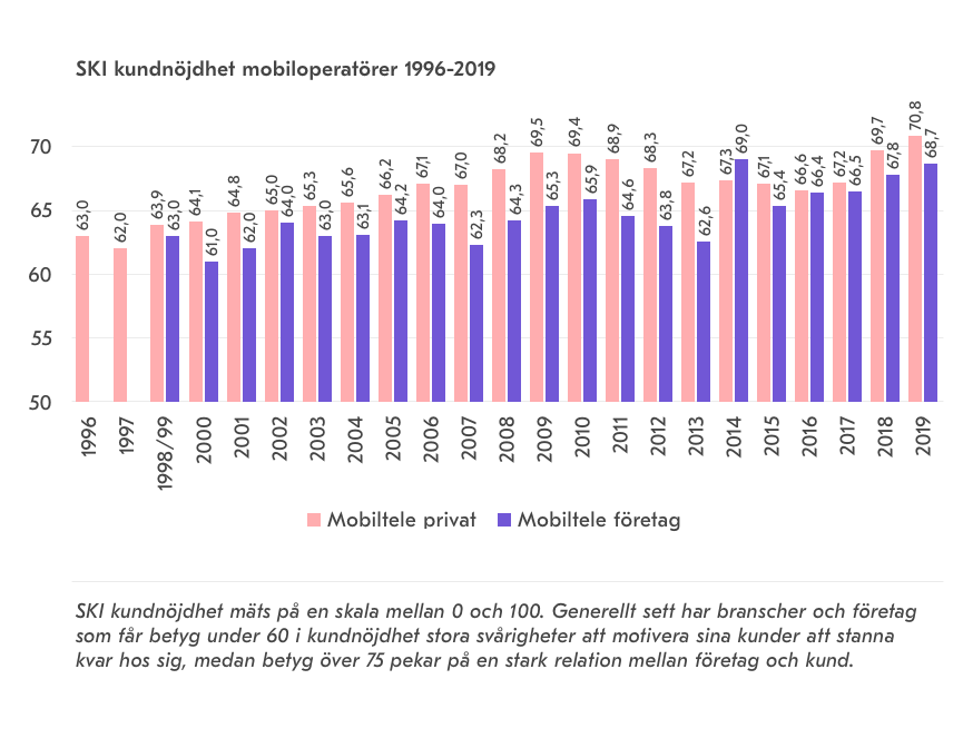 Kunderna är mer nöjda än någonsin. Årets förbättrade kundbetyg är ett resultat av att branschen under de senaste åren har lyckats förbättra sitt kundfokus. Alla aktörer har över tiden även fått allt bättre betyg kring frågor som hur enkelt det är att vara kund och om kunderna upplever att leverantören har en tjänst som passar just dem.