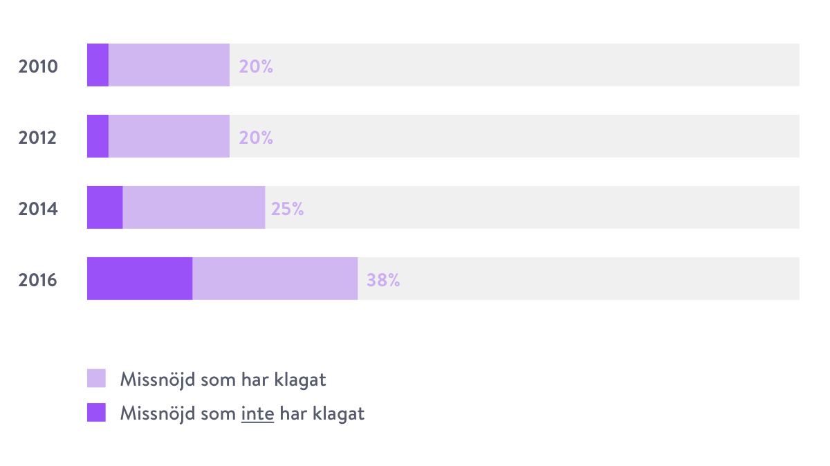 2010 var 20 % missnöjda, men av alla de som var missnöjda valde 15 % att inte klaga. Siffrorna var desamma för 2012, men hade ökat till mätningen 2014: då var 25 % missnöjda, och av dem valde 20 % att inte klaga. Hoppet mellan 2014 och 2016 är ännu större: i årets mätning var 38 % missnöjda, och av dem valde drygt 39 % att inte säga något. Fortsätter det i den här takten lider snart hälften av alla kunder i tysthet.