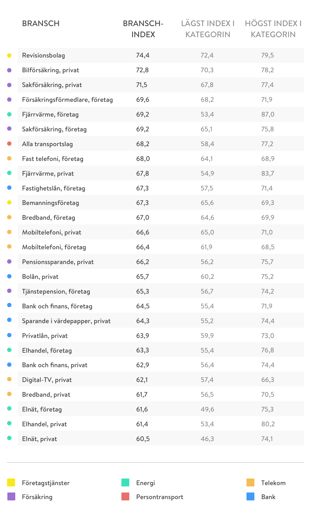 Energibranschen är den mest splittrade; underkategorierna innehåller både de högsta och de lägsta indexen i hela mätningen. Trots att fjärrvärme företag, fjärrvärme privat och elhandel privat tar upp hela prispallen om man sorterar efter högst index i underkategorierna (87,0, 83,7 respektive 80,2), hamnar branschen som helhet i botten. Det påminner om Volvo i undersökningen Digital leaders in Sweden: Volvo var trea av alla företag i den mätningen, men de låga poängen hos resten av företagen i tillverkningsbranschen gjorde att Volvos bransch ändå hamnade sist i rankningen.