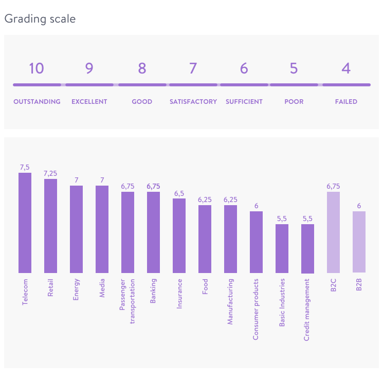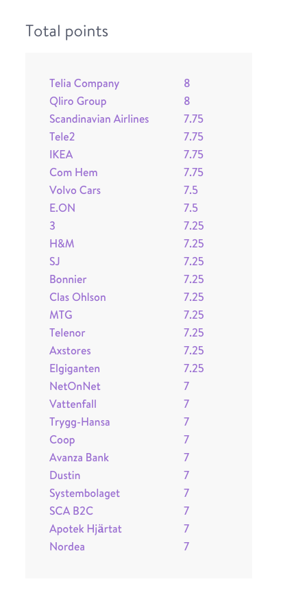 Sammanfattningsvis så kan vi säga att många branscher och företag är på rätt spår, men det finns utrymme för förbättringar. Telia och Qliro Group (som bland annat äger CDON, Gymgrossisten och tretti.se) är ledarna på 8 poäng. Det är absolut inte dåligt, men som sagt: 7 är medel på skalan.