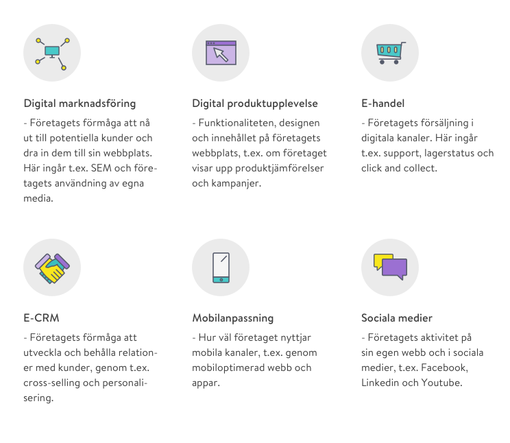 “Svenska storföretag har framför allt lagt tid och kraft på att utveckla den digitala produktupplevelsen och de har också satsat en hel del på mobila tjänster. Däremot skulle de kunna förbättra sig när det gäller digital marknadsföring, e-handel och digital hantering av kundrelationer, då dessa tre dimensioner är speciellt viktiga för företagens tillväxt.”