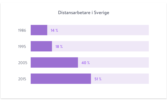Om vi hoppar fram tio år till i tiden, till 2005, jobbar totalt 40 % av Sveriges arbetskraft på distans. Ytterligare tio år senare, 2015, jobbar 51 % på distans. Det har alltså hela tiden ökat, men efter den stora ökningen på 22 procentenheter mellan 1995 och 2005 har ökningstakten gått ner till hälften: 11 procentenheter mellan 2005 och 2015. En anledning till den minskade ökningstakten kan vara de flesta som kan och vill distansarbeta började göra det redan under sent 90-tal och tidigt 00-tal.