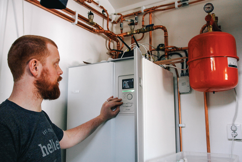 Dominerar rummet gör dock värmepumpen med dess spindelväv av ledningar ut och in. Simon flippar upp ett lock och visar displayen. Siffror tickar på överallt, små ikoner erbjuder ett utbud av menyalternativ som är av storleksordningen kinesisk restaurang.