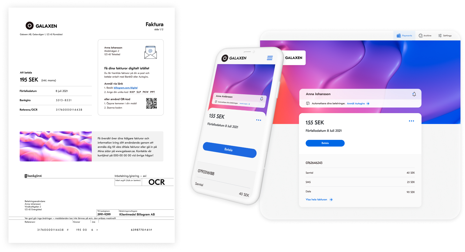På Billogram vet vi att fakturan ofta är associerad med onödigt mycket arbete, som ofta leder till missnöje och frustration hos mottagaren. Genom att låta enkla och uppskattade betalsätt som direktbetalningar och Swish flytta in på fakturan - samtidigt som många av de vanligaste orsakerna till felbetalningar designas bort - framträder en betalning som gynnar både företag och deras kunder. Resultatet är nöjdare kunder som tack vare en smidigare upplevelse betalar snabbare.